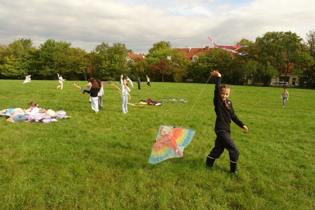 Am 10. Oktober waren die 2b und die 3b Drachensteigen. Wir hatten wirklich Glück mit dem Wetter: Die Sonne wärmte uns und der Wind trieb die Drachen ziemlich hoch in die Luft. Die beiden Klassen hatten großen Spaß an diesem Vormittag.