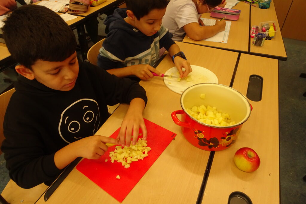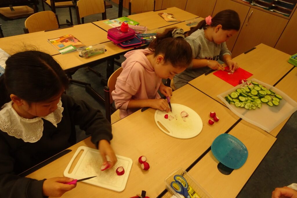 Am 1. Oktober 2025 waren die 2b und 3b am Meidlinger Markt, um Gemüse und Obst einzukaufen. Der Obstsalat wurde anschließend gleich zubereitet, zwei große Schüsseln pro Klasse. Alles wurde leergegessen! Am nächsten Tag schnitten die Kinder das Gemüse auf, auch hier griffen die Kinder gerne zu.
