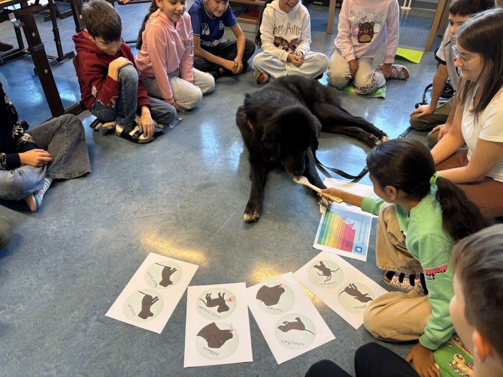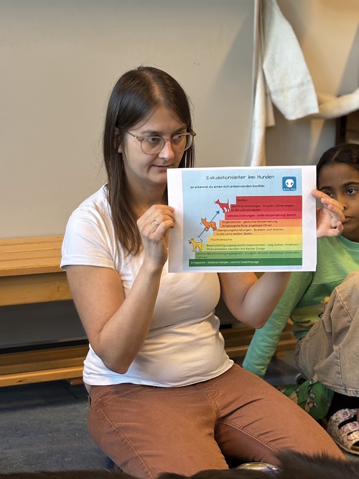 Dieses Mal war Palu mit seinem Frauchen Alexandra Mindt bei uns zu Gast. Von Frau Lehrerin Alexandra erfuhren wir einiges über die Eskalationsleiter bei Hunden und wissen nun, worauf wir im Umgang mit fremden Hunden achten müssen.