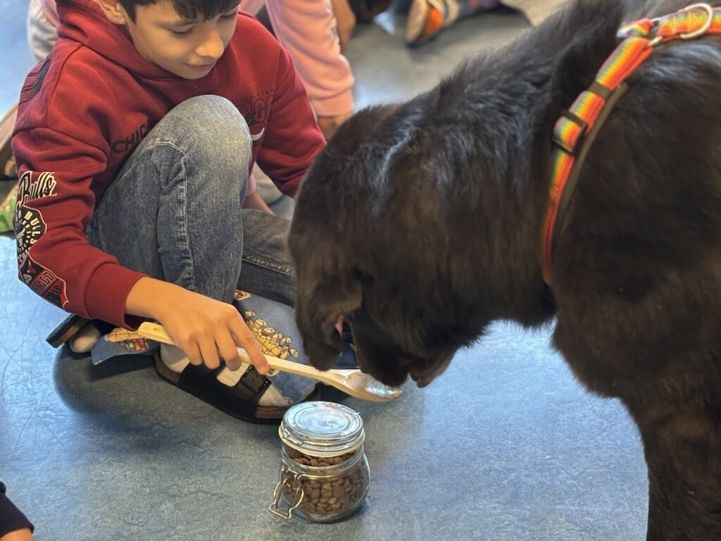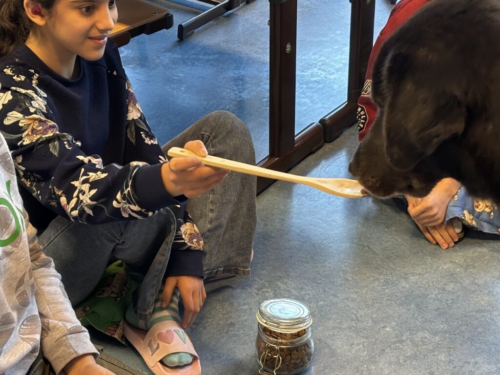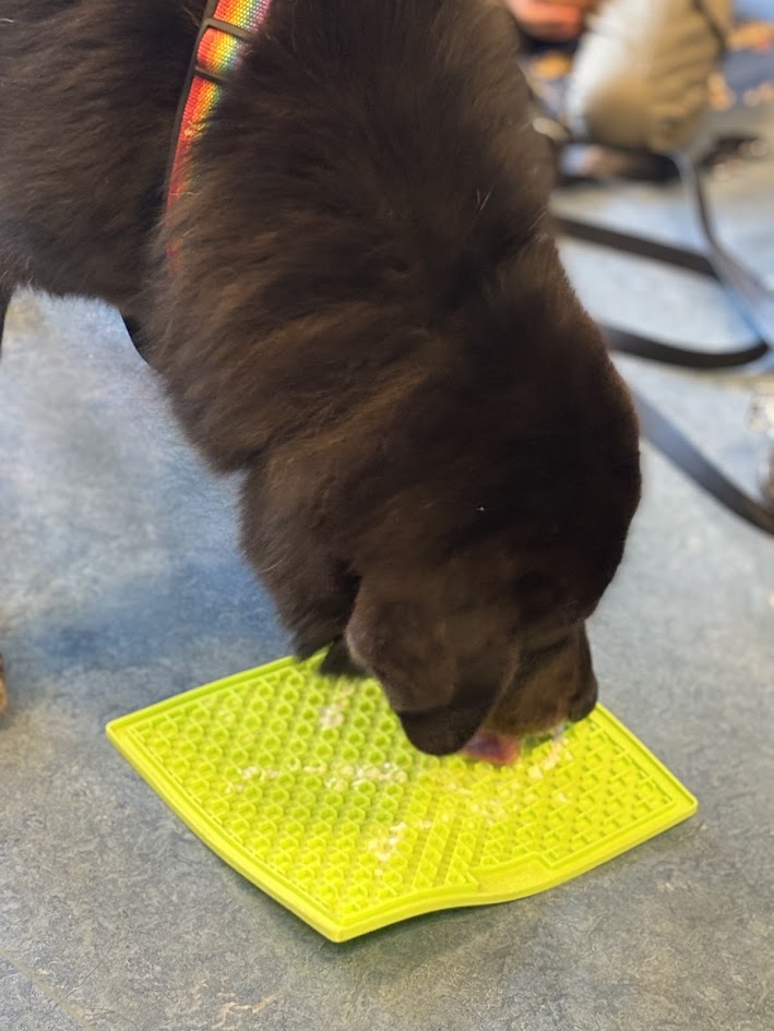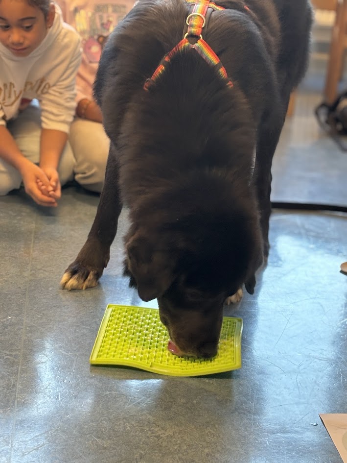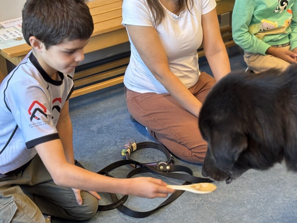 Danach durfte jedes Kind Palu mit einem Leckerli füttern. Zum Schluss bekam Palu noch Jogurt auf seiner Schleckmatte. Das schmeckte ihm besonders gut.
