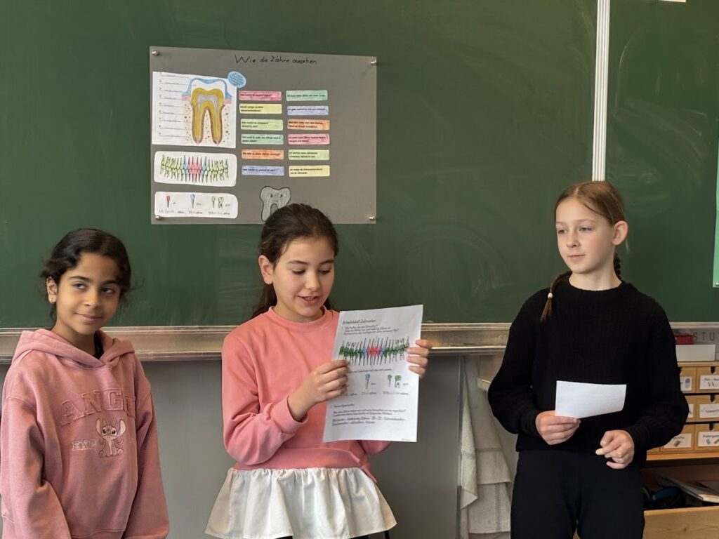 Dafür wurden Plakate zu den Themen Ernährung, Zähne, Kariesentstehung und Zahnarztbesuch erstellt, die den MitschülerInnen in Kurzreferaten vorgestellt wurden. Nach dieser Doppelstunde steht fest, dass viele Kinder schon richtige ZahngesundheitsexpertInnen sind.